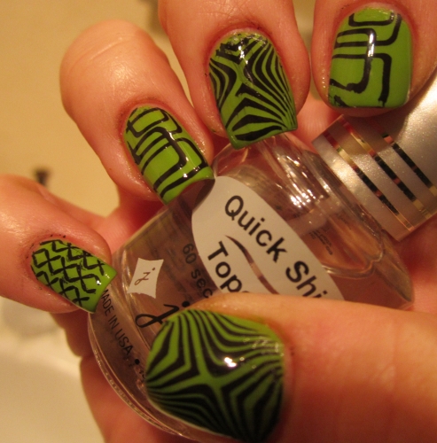 The verdict: Holy crap it works. I waited until I was done stamping my entire hand, applied the top coat, and there was no dragging! The dragging you see on the middle finger was completely my fault, I left some hangy bits of the Konad polish. I know Seche Vite acts the same way, but this is only $1.99. I cannot attest to how long it wears or keeps your mani looking fresh, but I can say it's great for nail art, dries as quickly as all of the top brands, and leaves a shine that lasts for days (well as far as my impatience would allow me to test, 3).